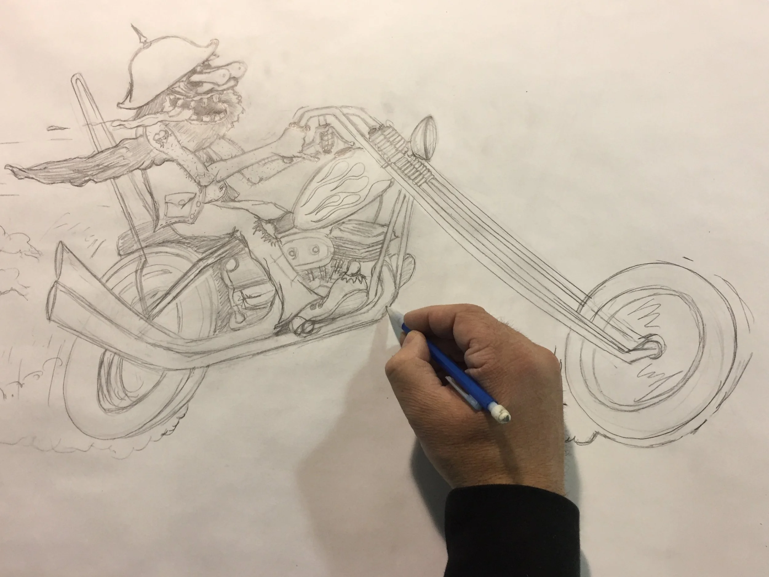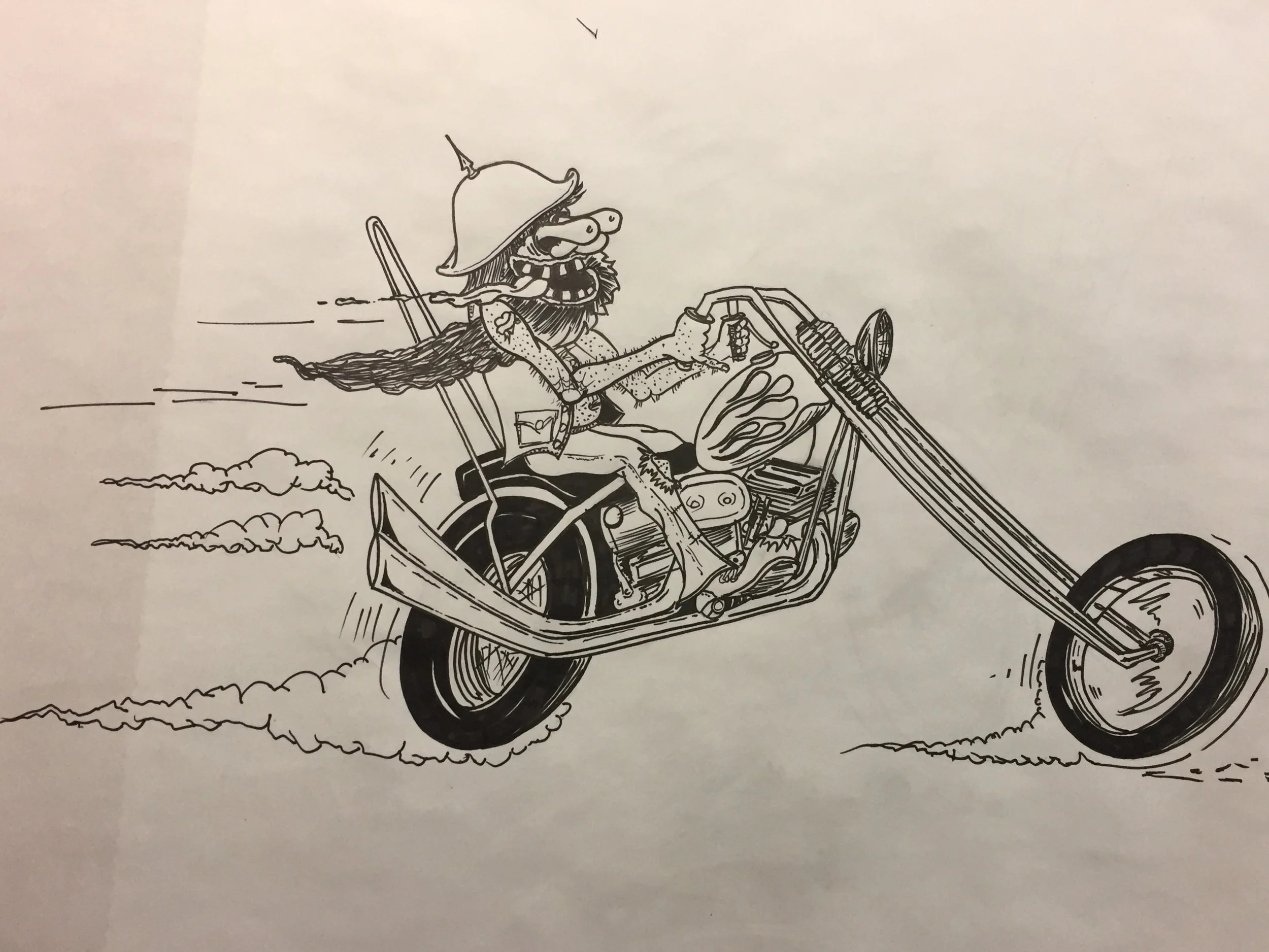 The request for this design was 60’s chopper-style art. I decided to do an old biker zooming through the countryside. A real fun design to do.