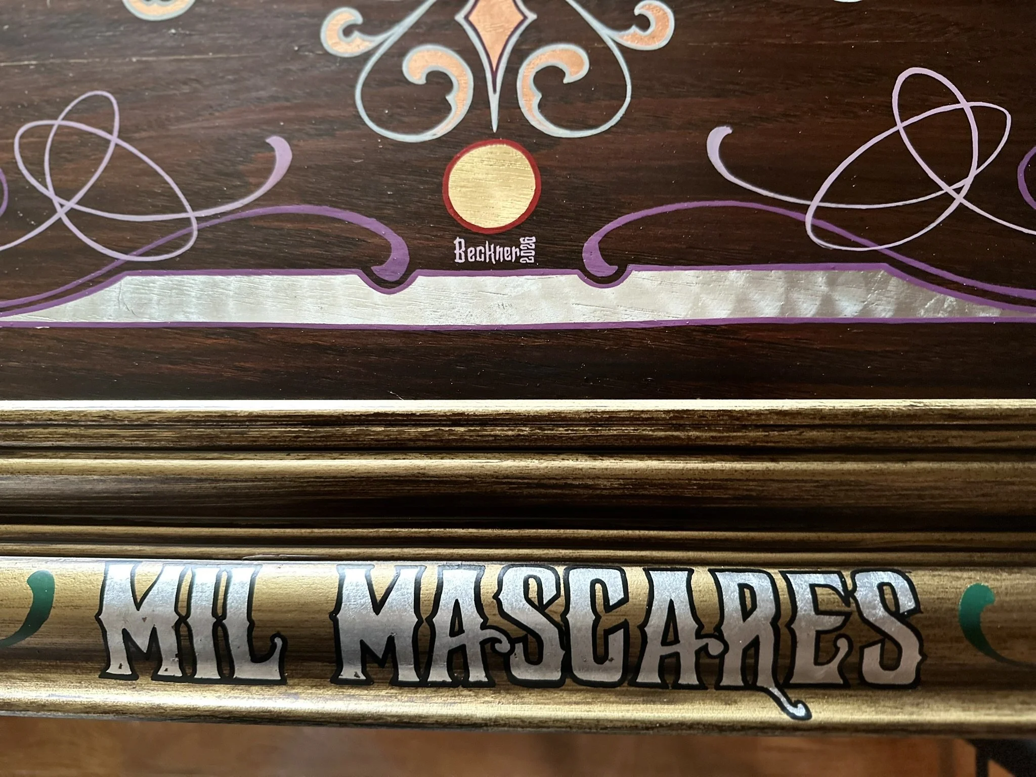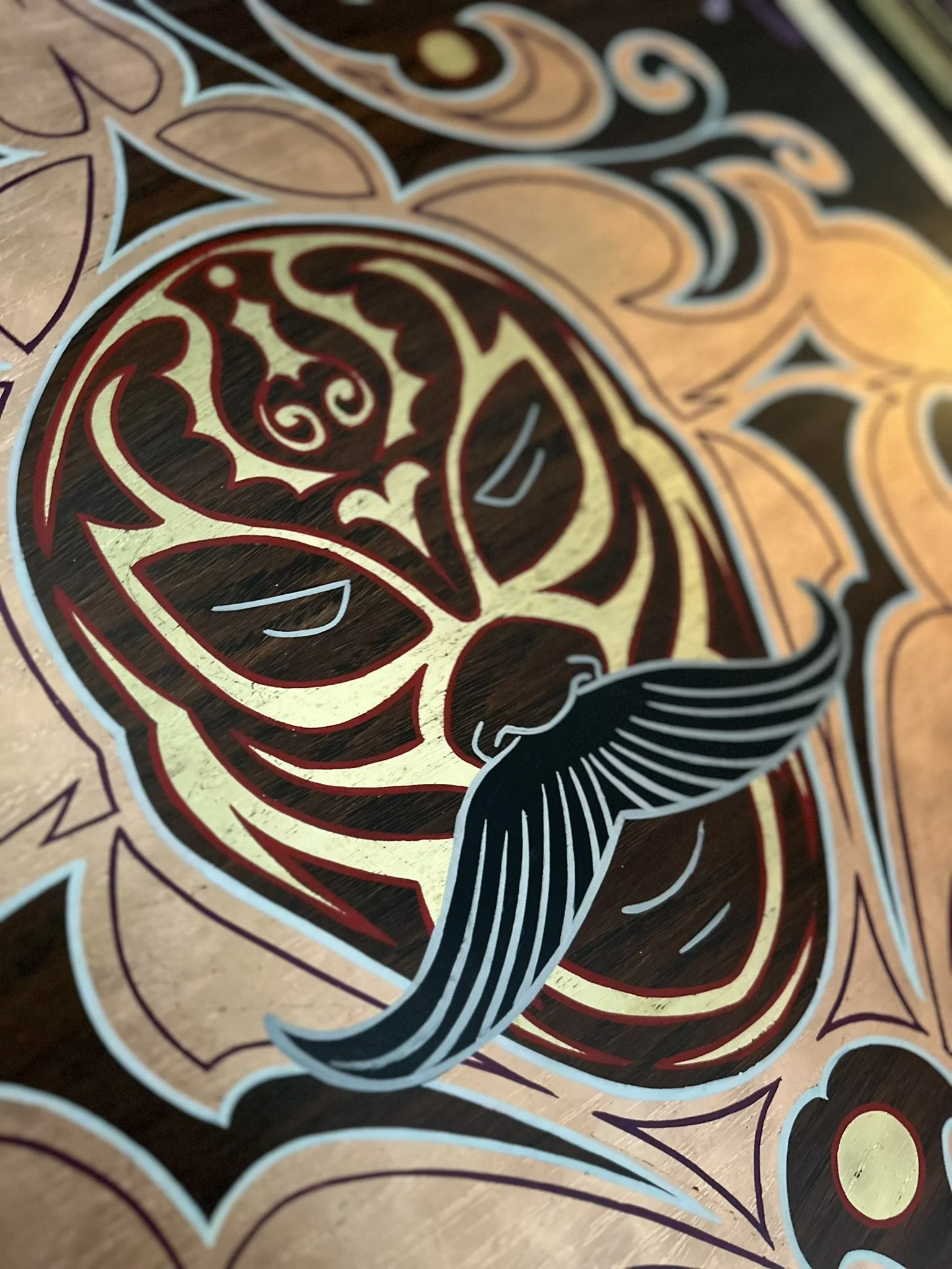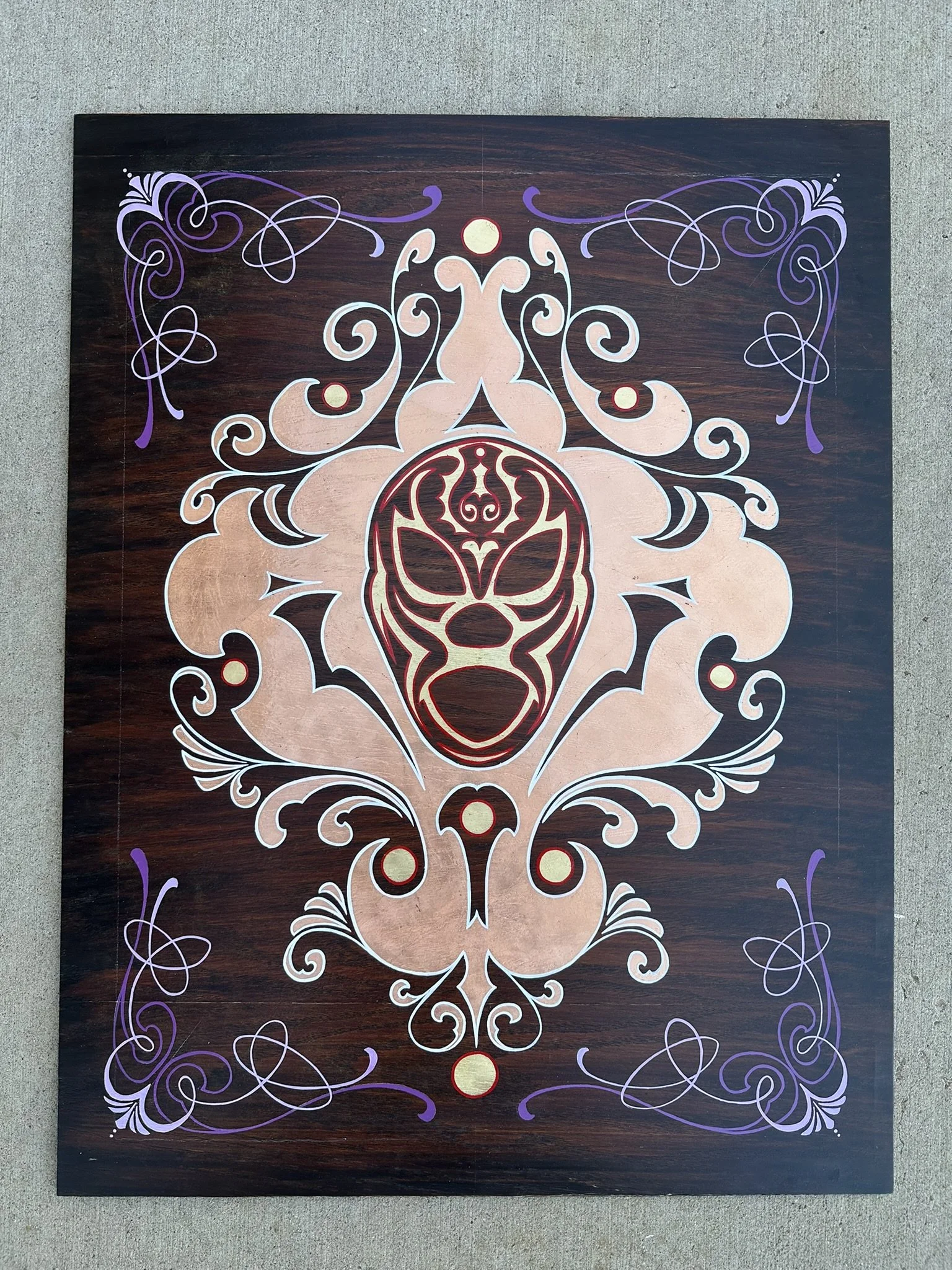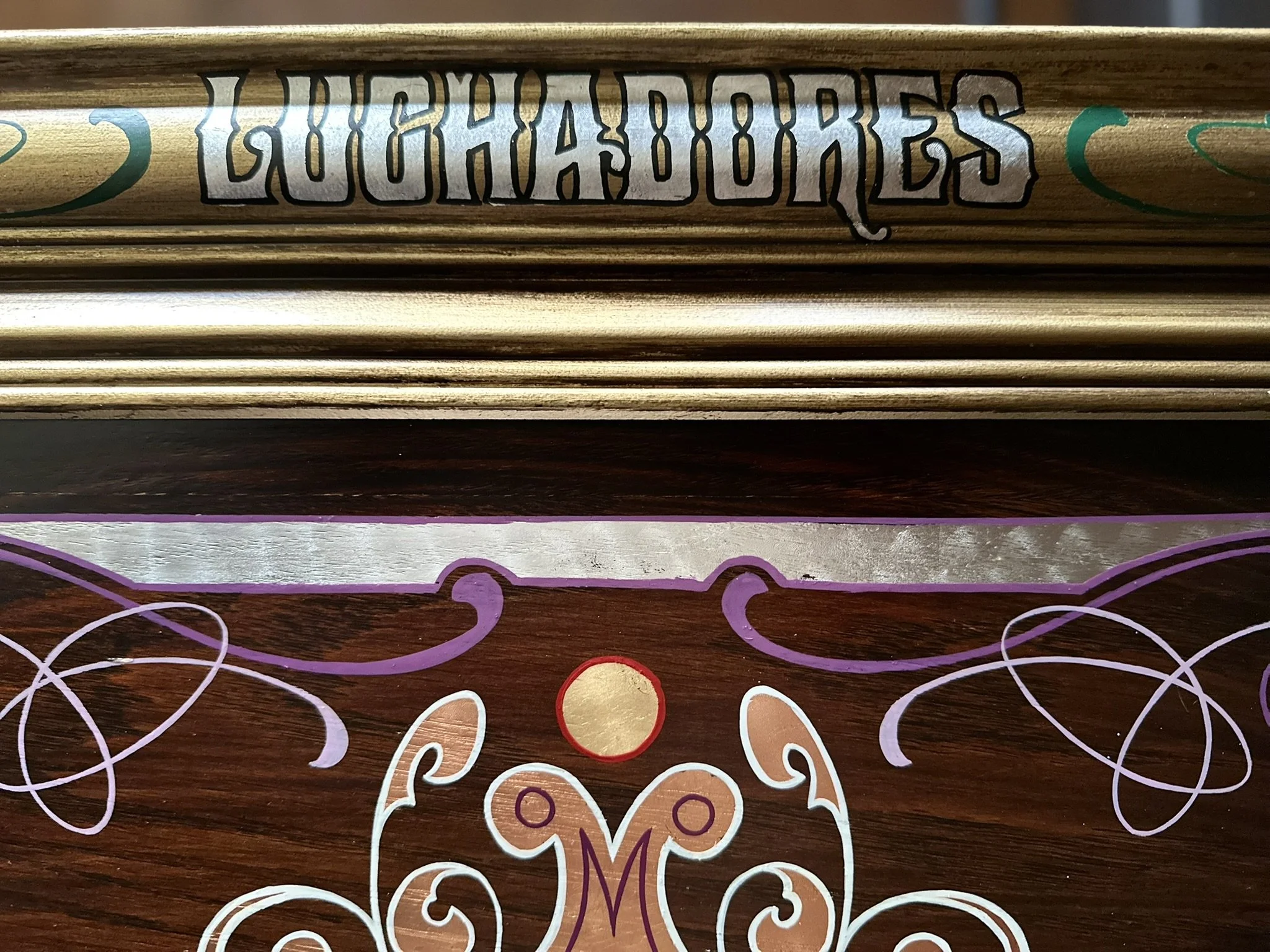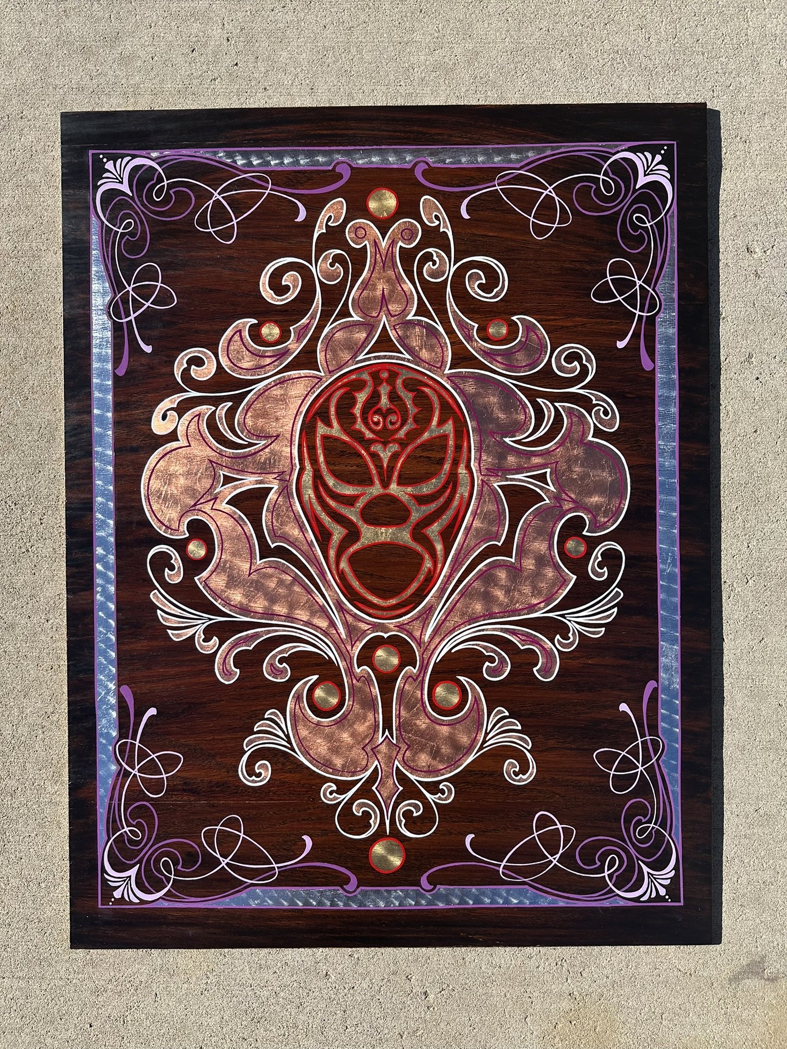 Well, here it is. A stained oak panel with gold, copper, & silver leaf topped off with white, red, lavender, and purple pinstriping. The custom made frame was painted gold and then distressed. On top of the frame is hand painted a mexican-style bouquet of flowers, pinstriping and letters in silver leaf “Luchadores - Mil Mascares” which means; “Wrestling - Thousand Masks”.