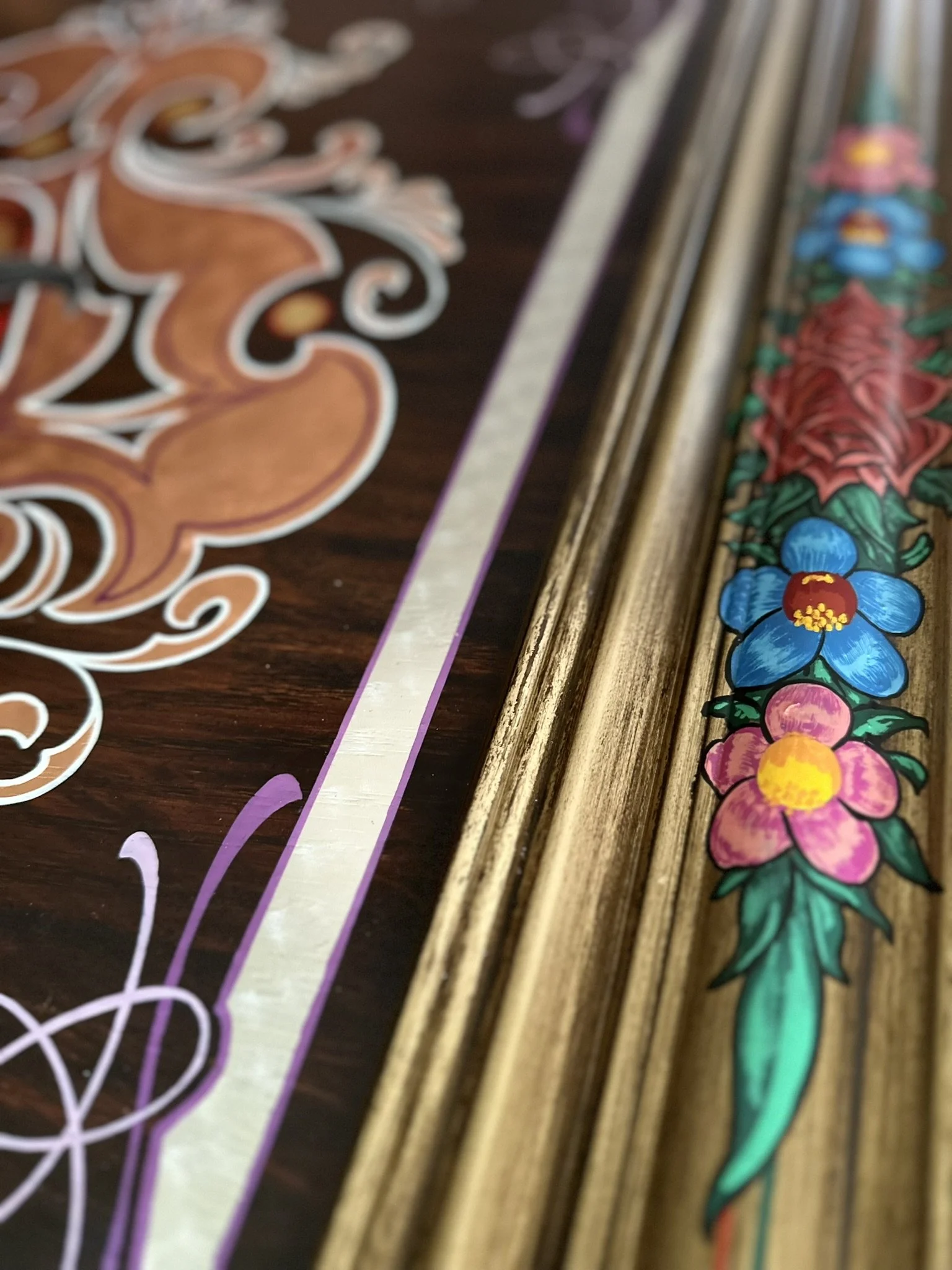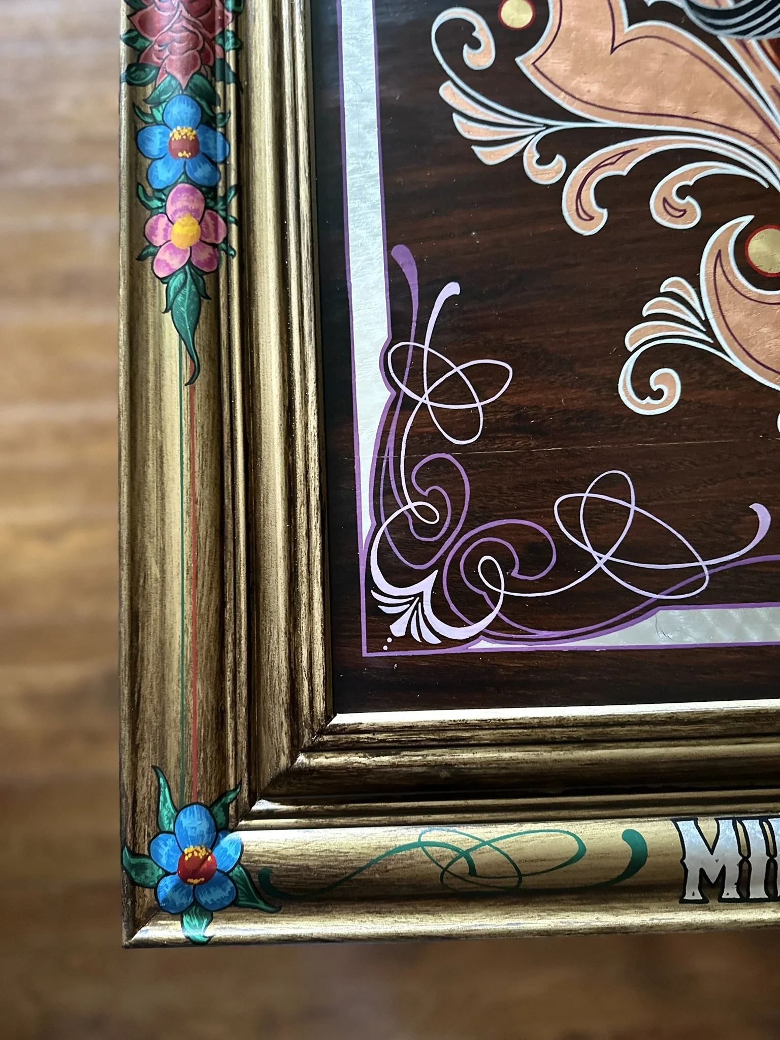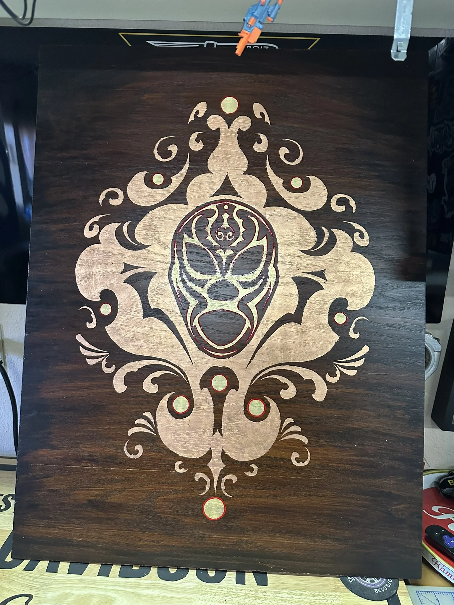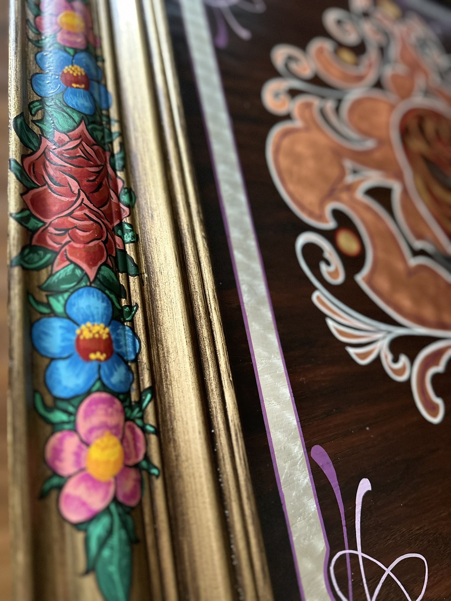 Well, here it is. A stained oak panel with gold, copper, & silver leaf topped off with white, red, lavender, and purple pinstriping. The custom made frame was painted gold and then distressed. On top of the frame is hand painted a mexican-style bouquet of flowers, pinstriping and letters in silver leaf “Luchadores - Mil Mascares” which means; “Wrestling - Thousand Masks”.