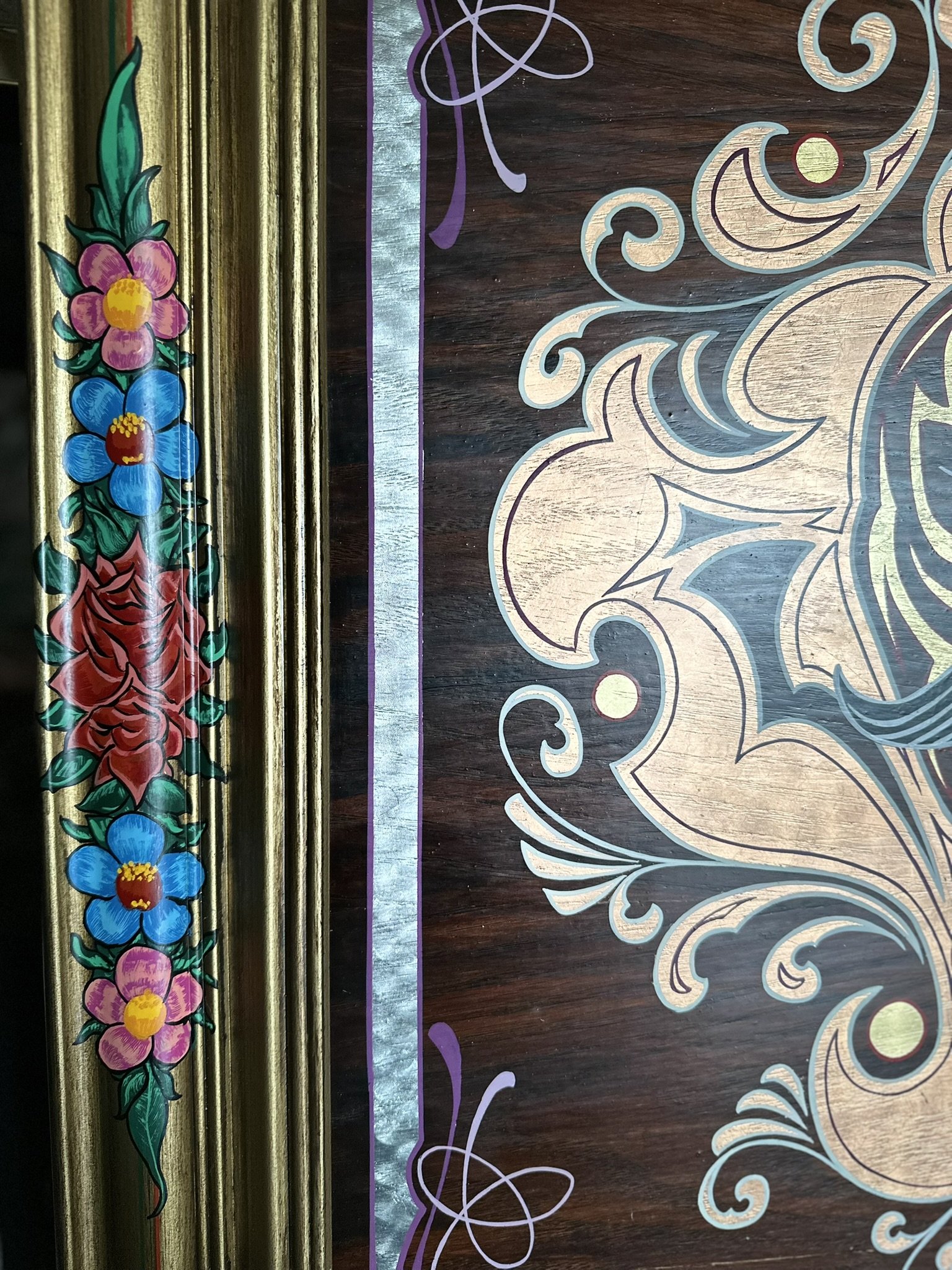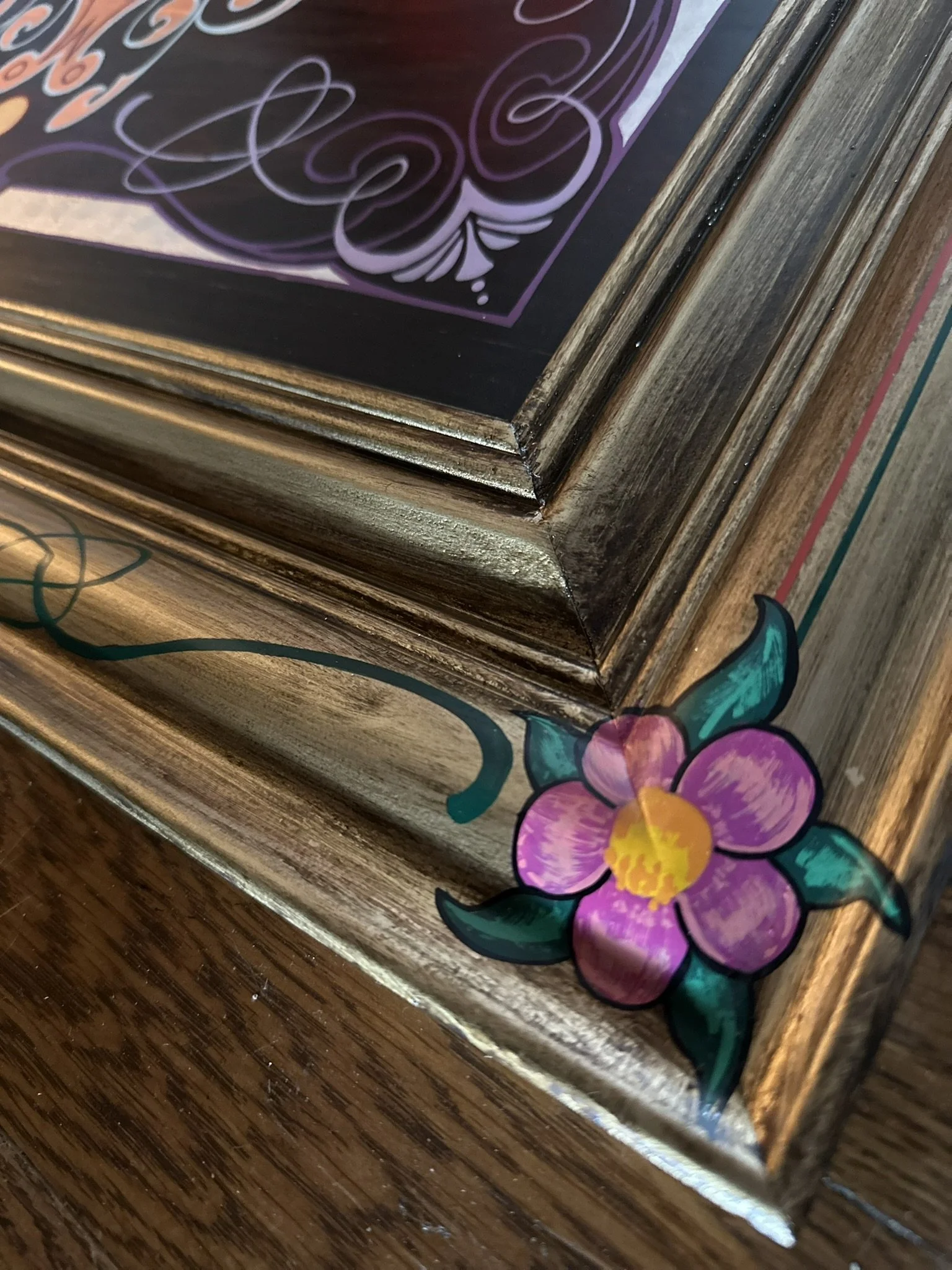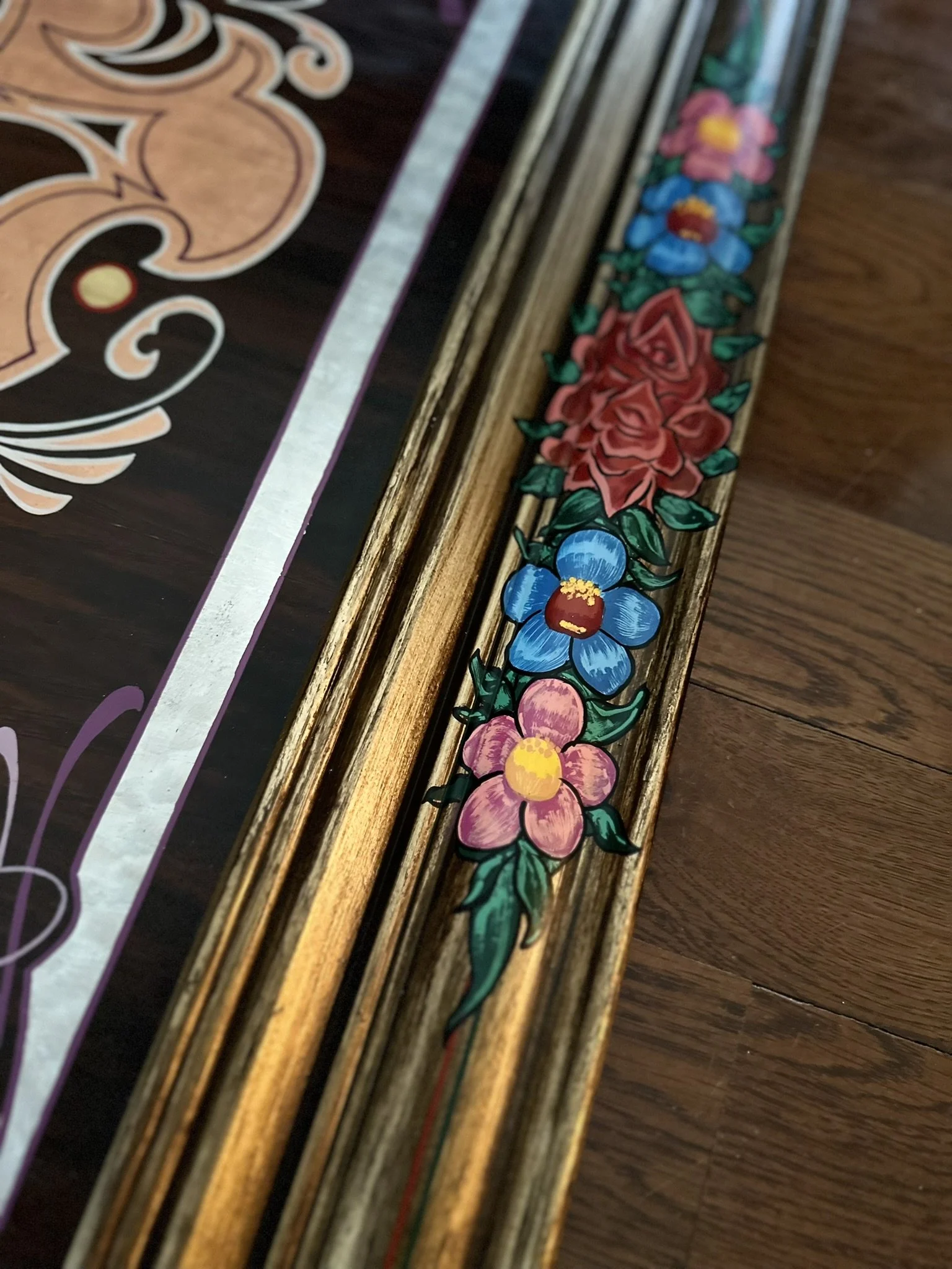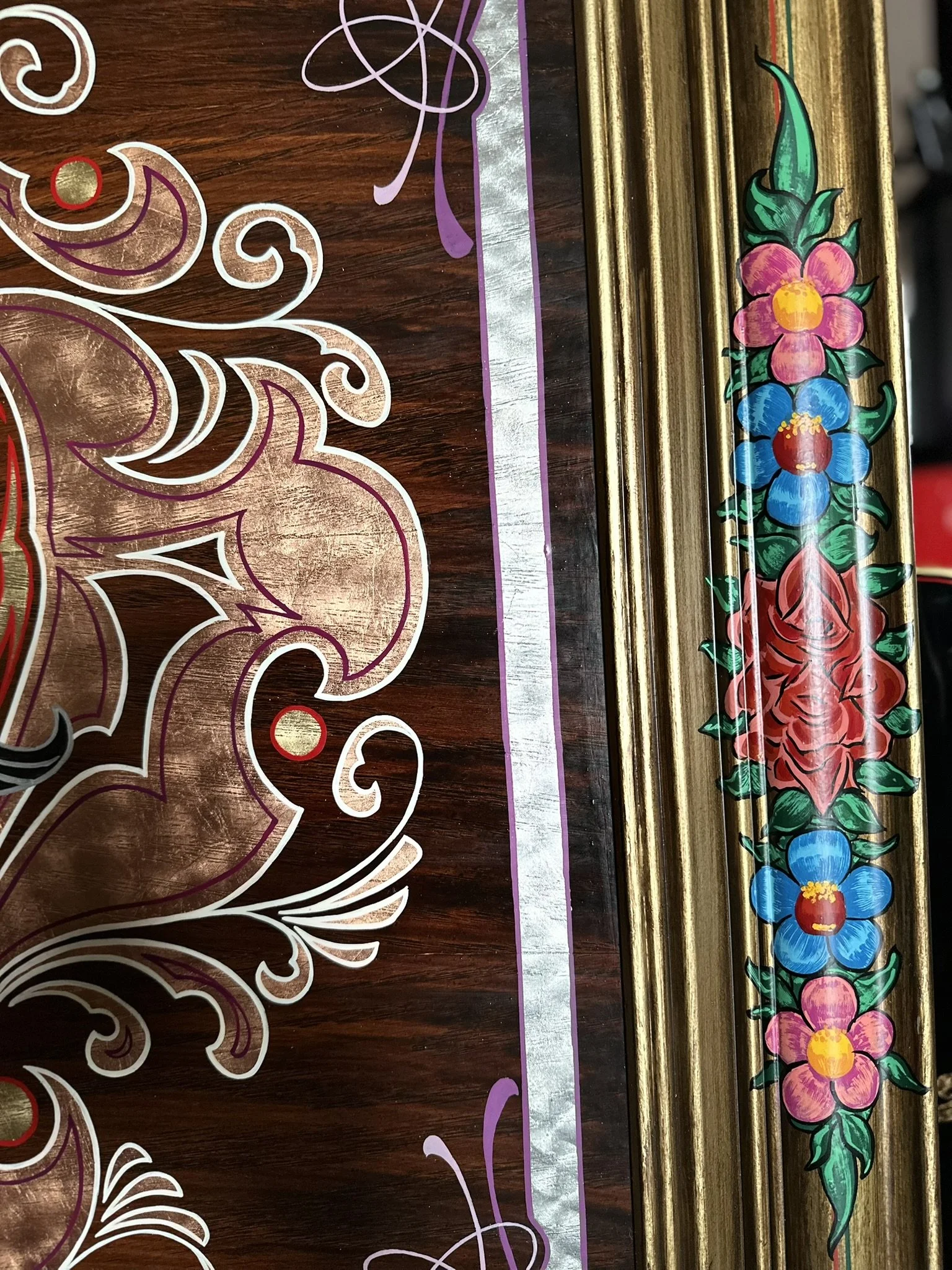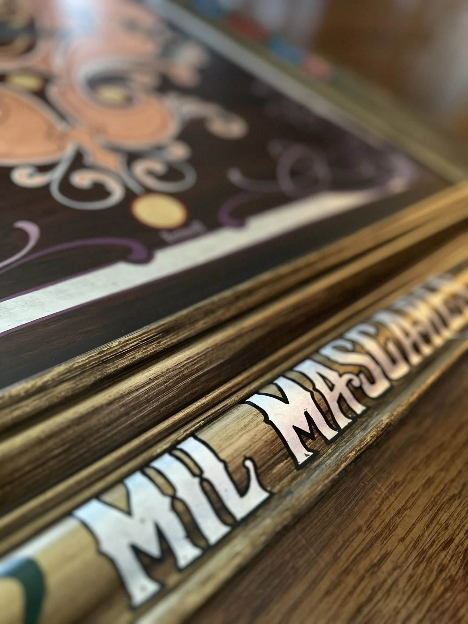 Well, here it is. A stained oak panel with gold, copper, & silver leaf topped off with white, red, lavender, and purple pinstriping. The custom made frame was painted gold and then distressed. On top of the frame is hand painted a mexican-style bouquet of flowers, pinstriping and letters in silver leaf “Luchadores - Mil Mascares” which means; “Wrestling - Thousand Masks”.