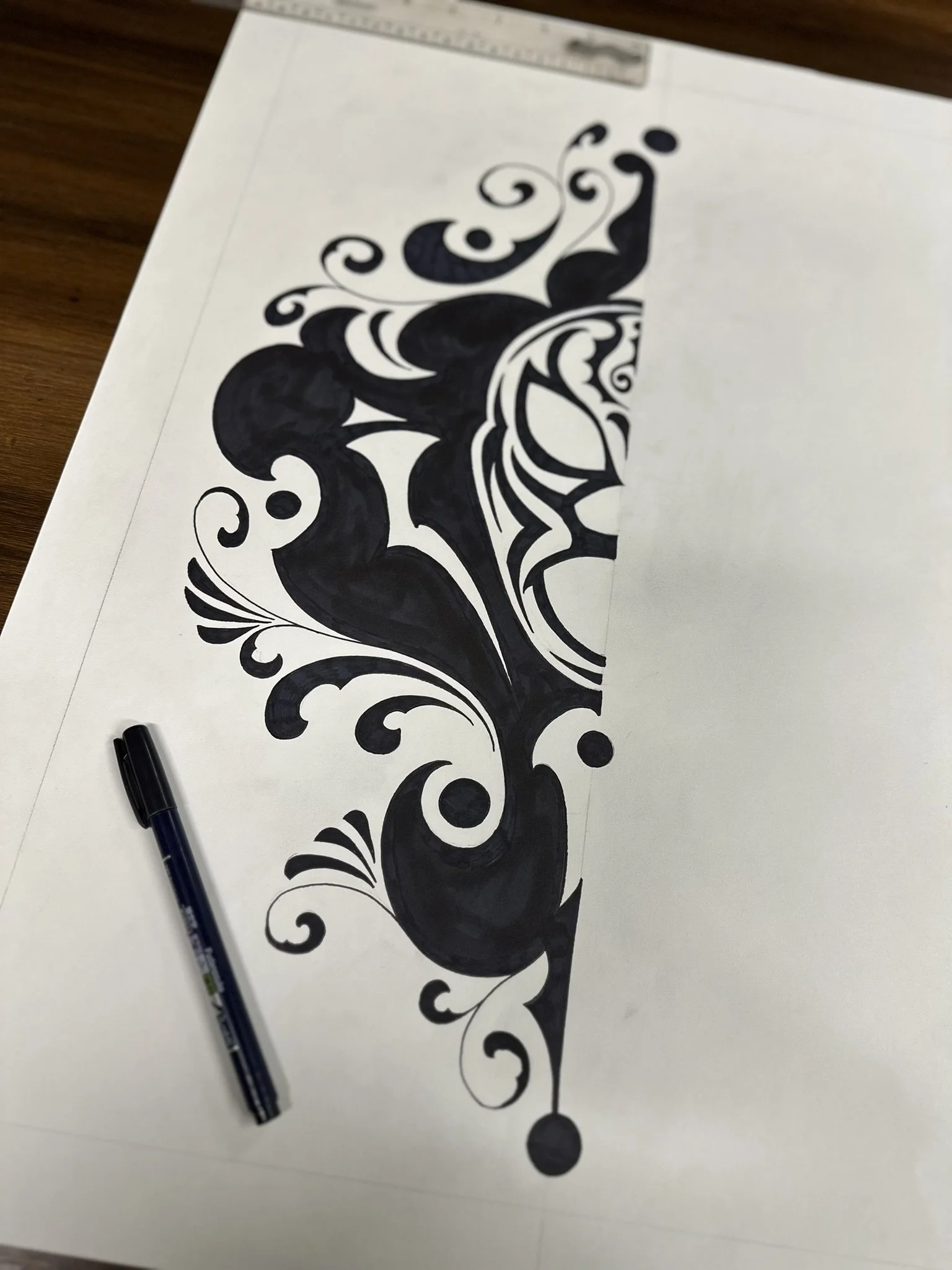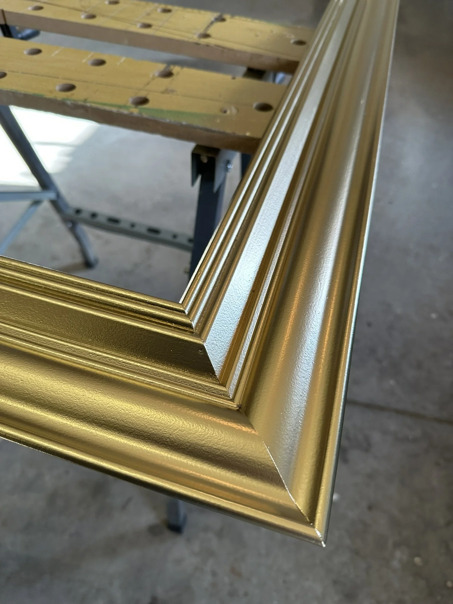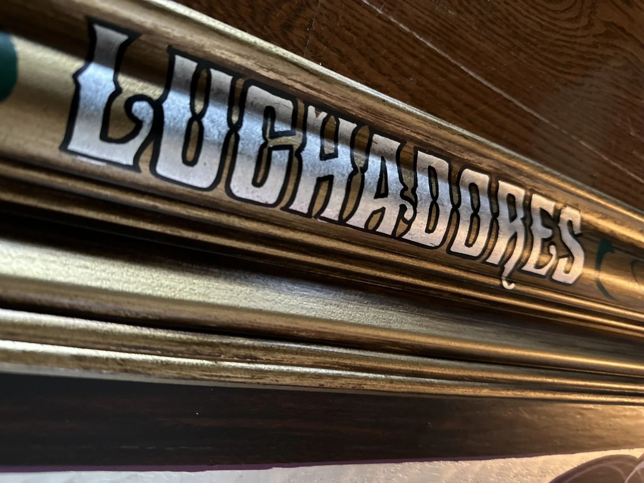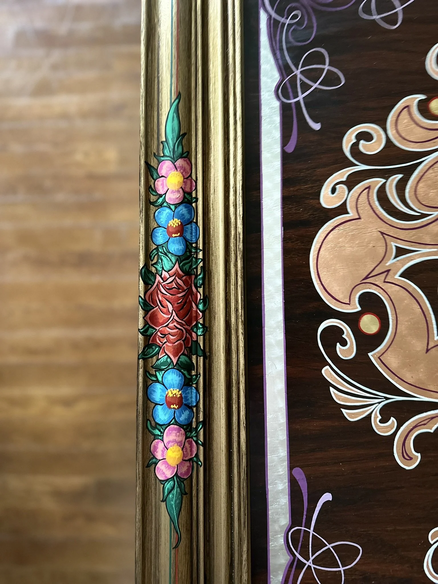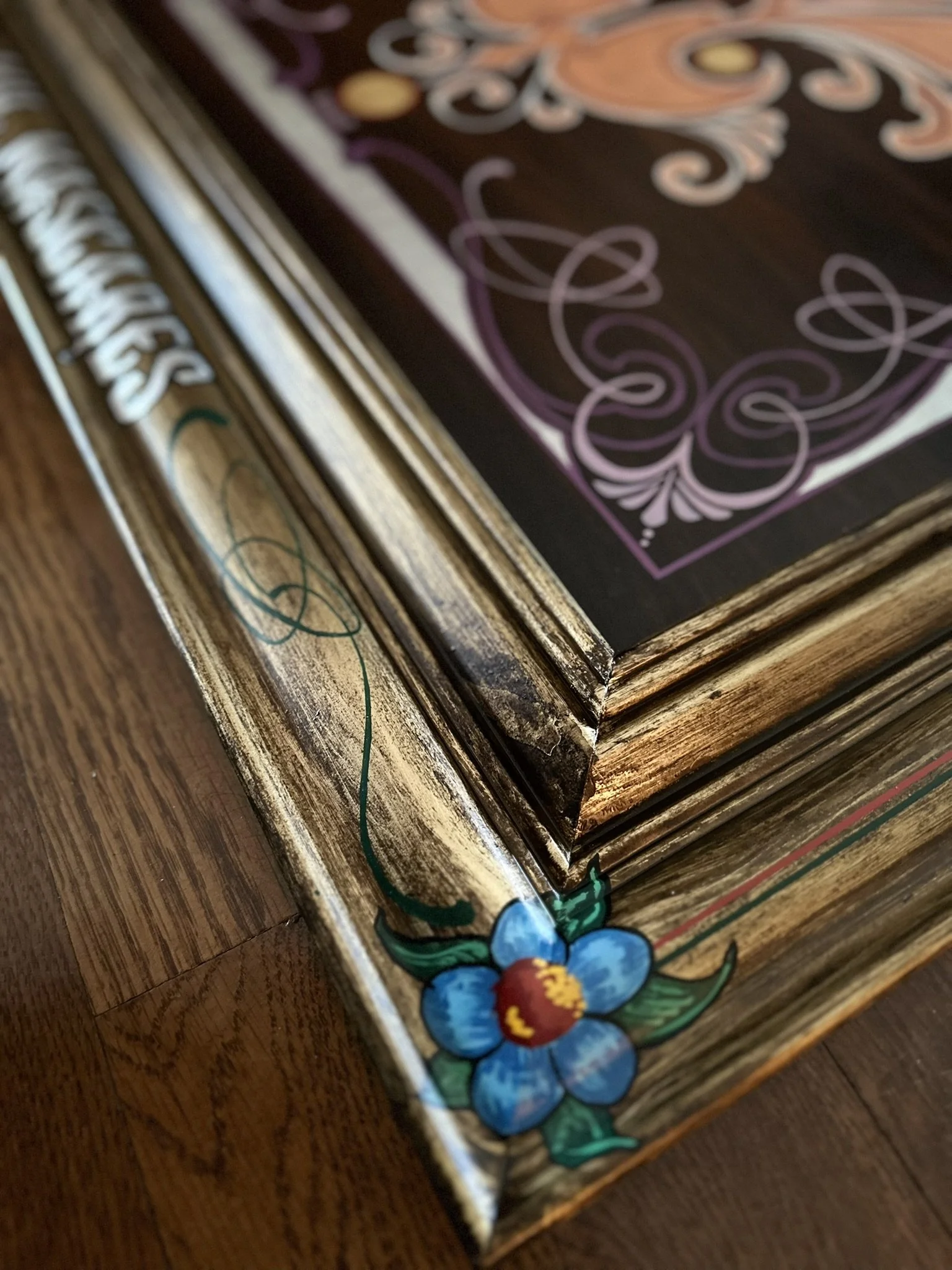 Well, here it is. A stained oak panel with gold, copper, & silver leaf topped off with white, red, lavender, and purple pinstriping. The custom made frame was painted gold and then distressed. On top of the frame is hand painted a mexican-style bouquet of flowers, pinstriping and letters in silver leaf “Luchadores - Mil Mascares” which means; “Wrestling - Thousand Masks”.
