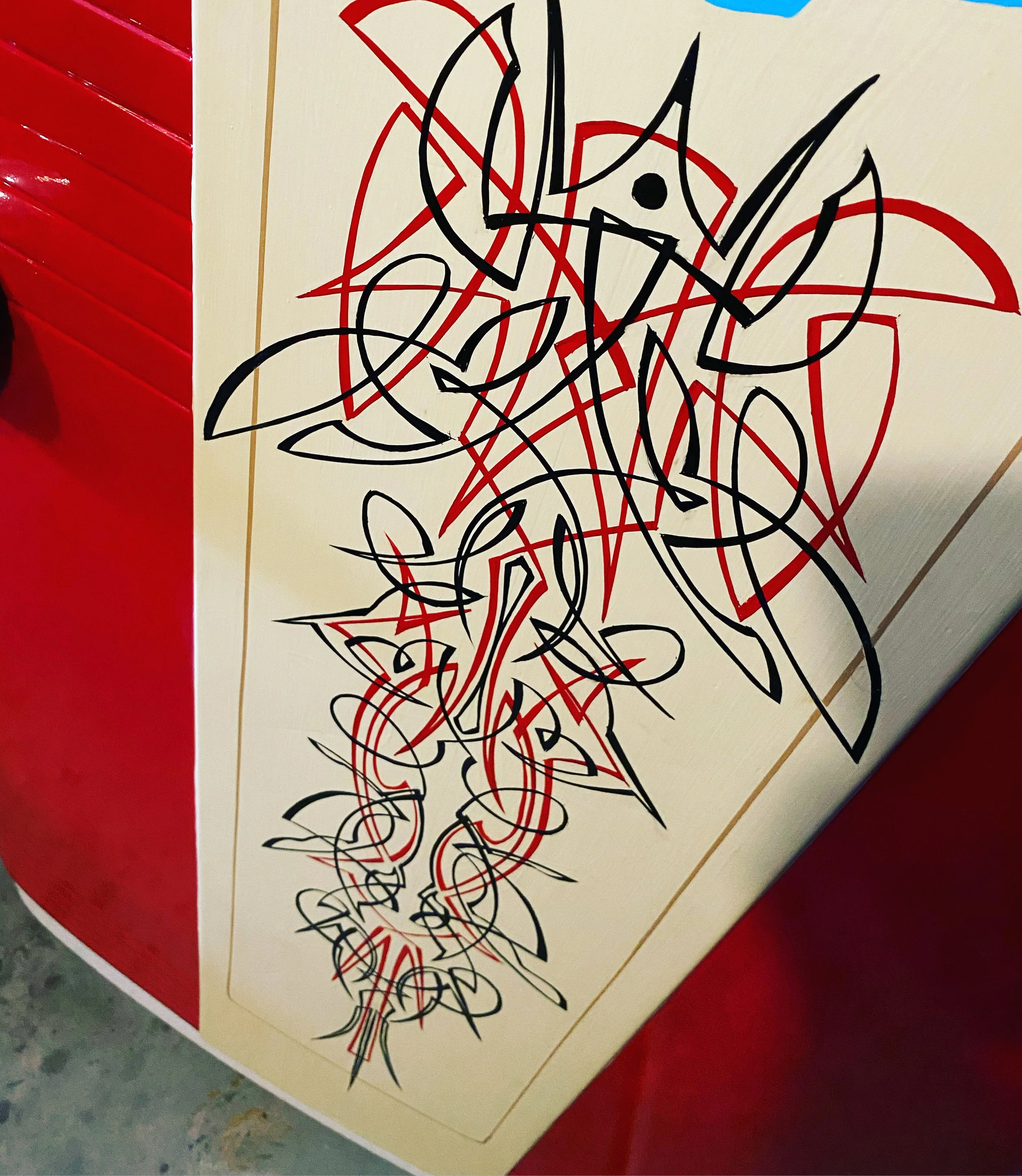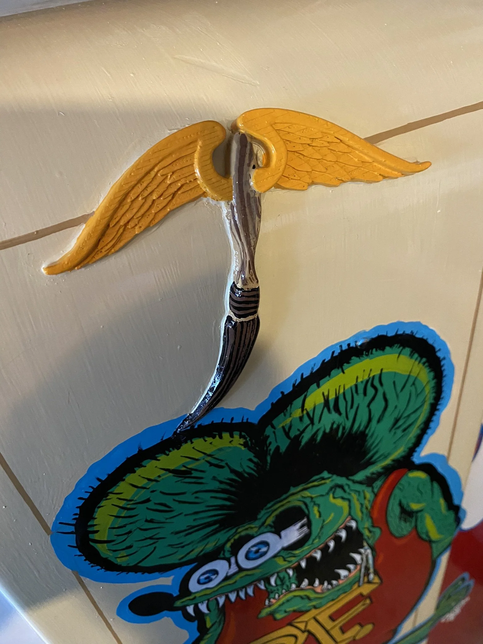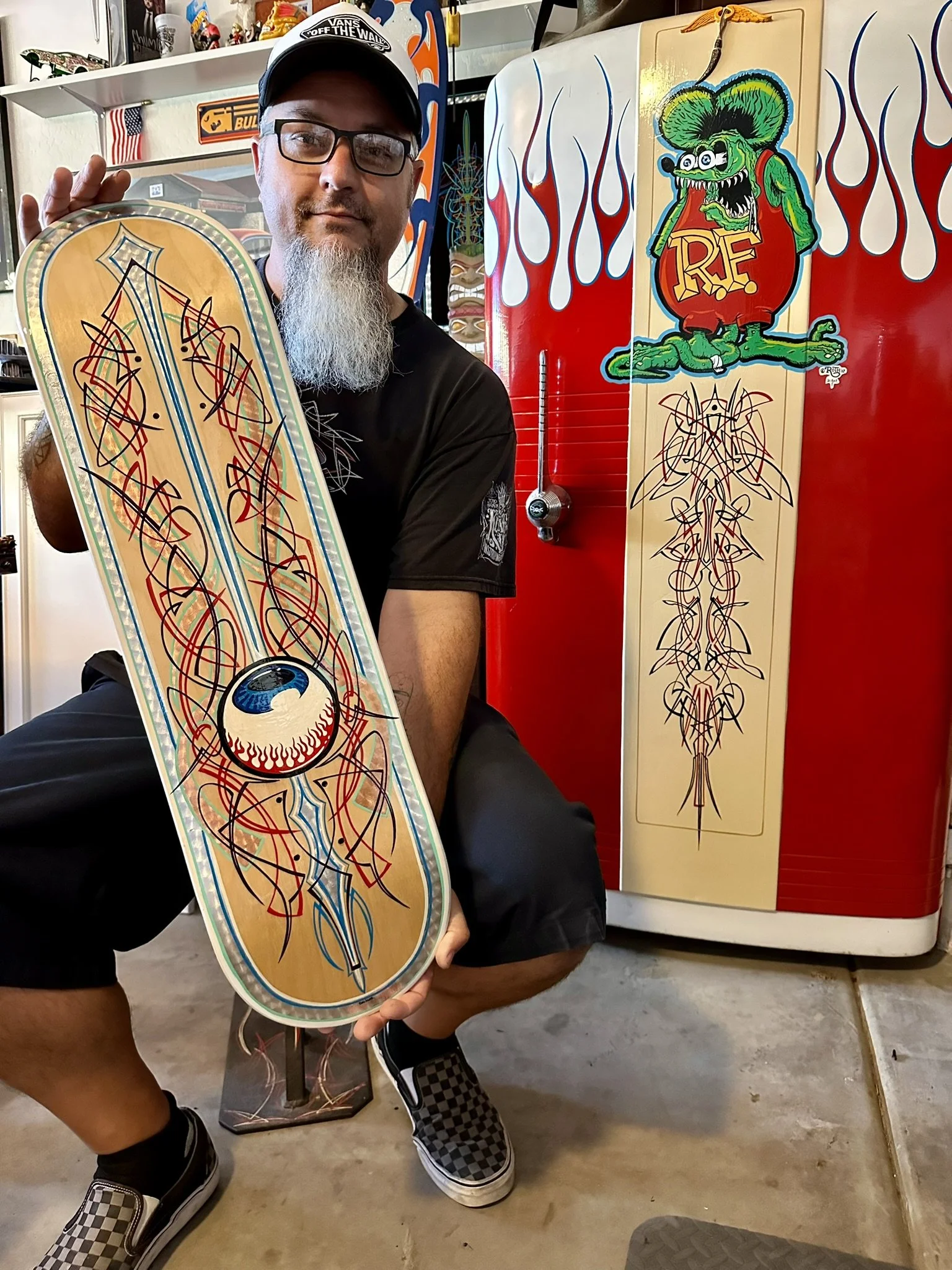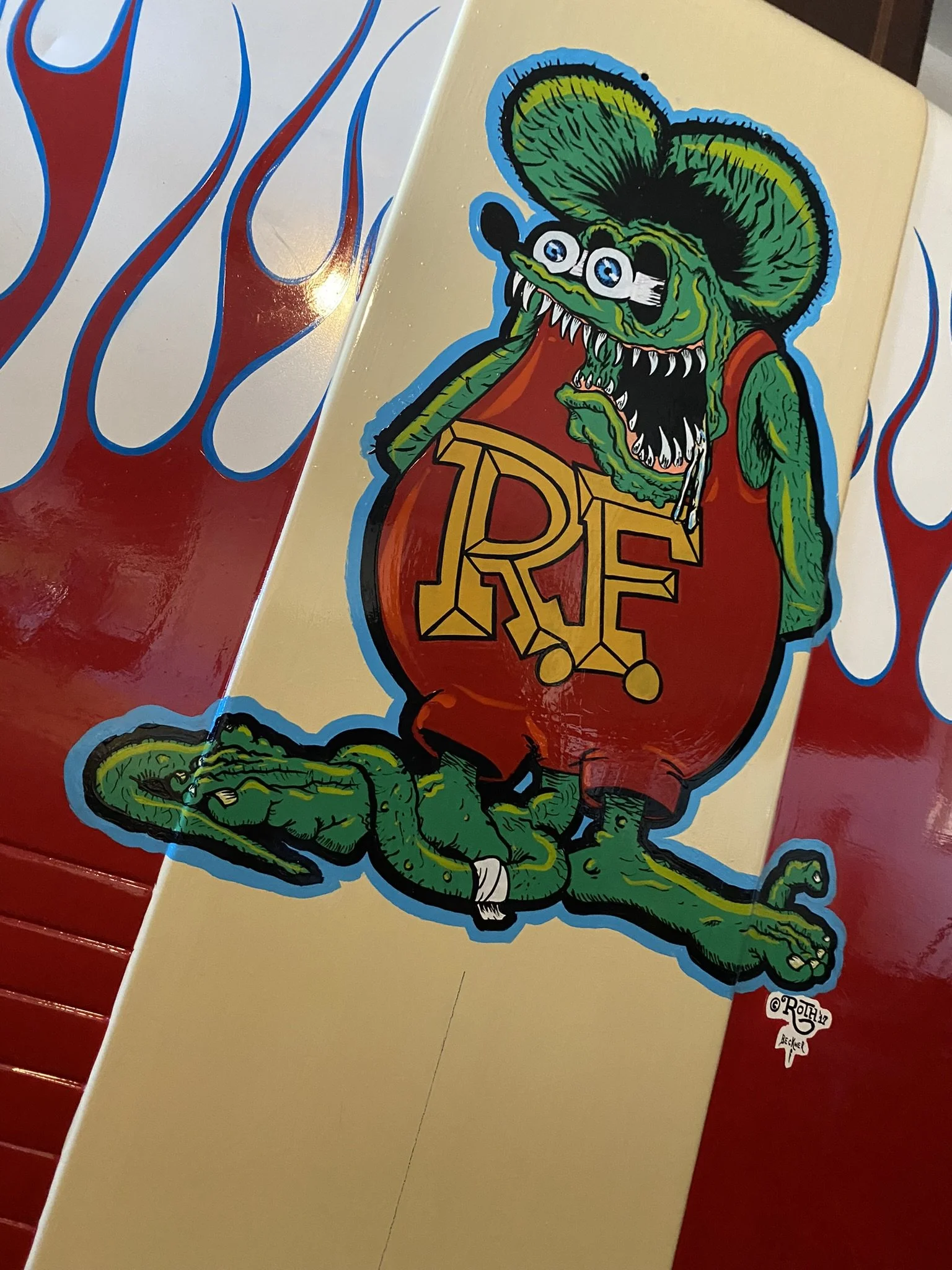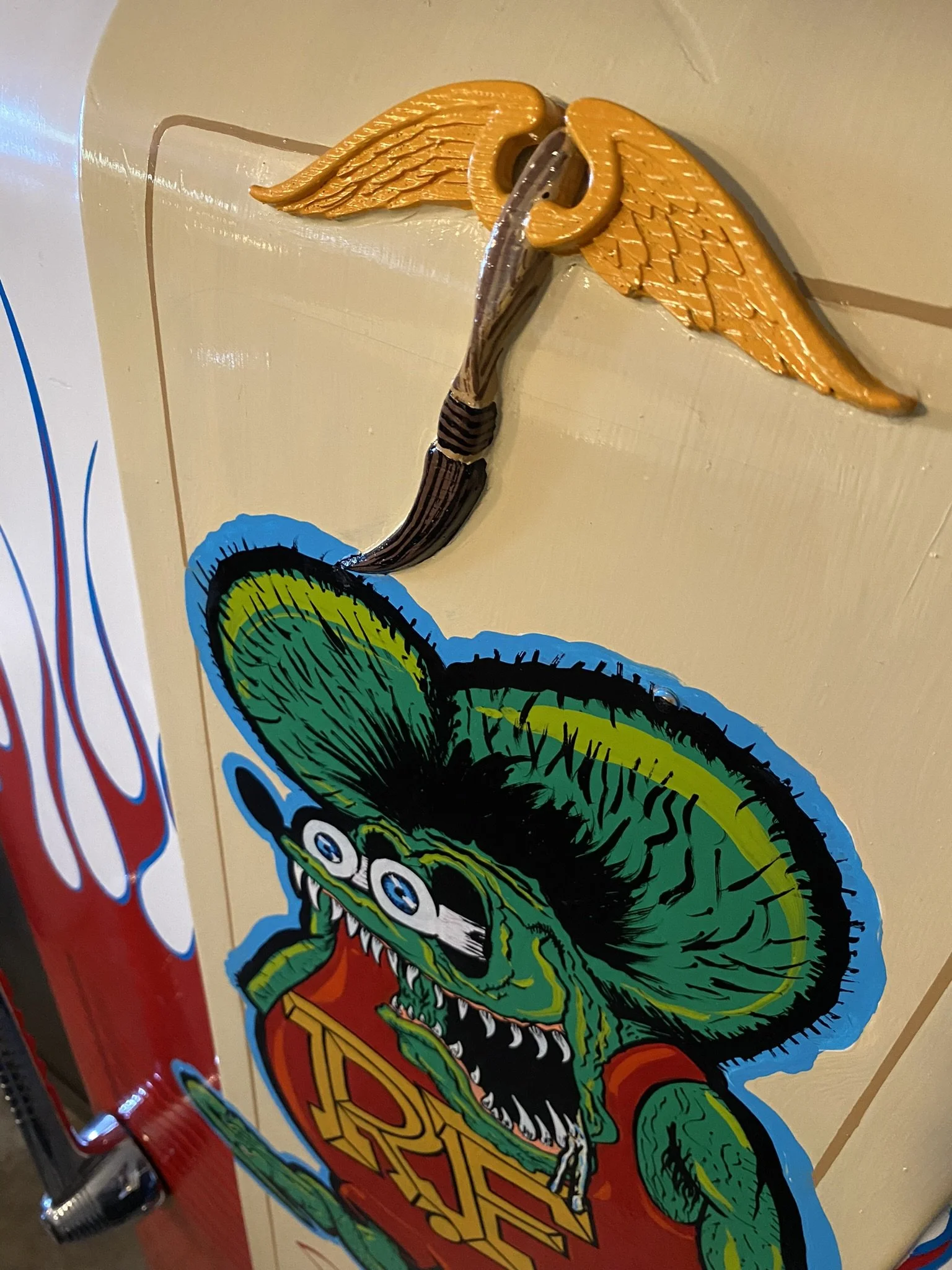 Rat Fink has been a favorite of mine since I was really little. Seeing him in Cartoons Magazine and in anything that had to do with Hot Rodding. I had this old vintage Firestone refrigerator. It doesn’t work but is a great storage for my brushes and chemicals for what I do. I couldn’t leave it plain, so I “Finked” it up!
